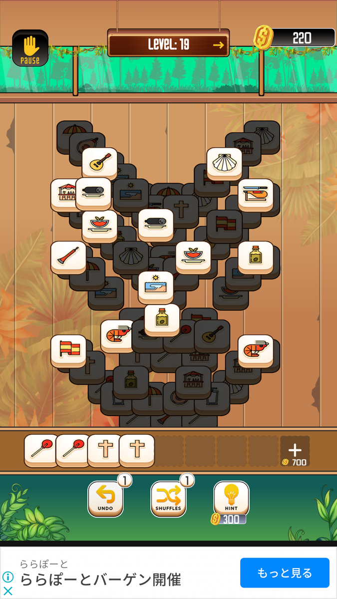 シャッフルするとわかりますが、右側にタイルがずれているだけでタイルはあるので、ヒントとシャッフルを上手い具合に使うと少しずつ減らせます